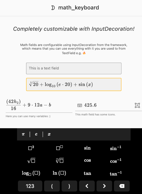 Math expression editing using an on-screen software keyboard or physical keyboard input in a typeset input field in Flutter.